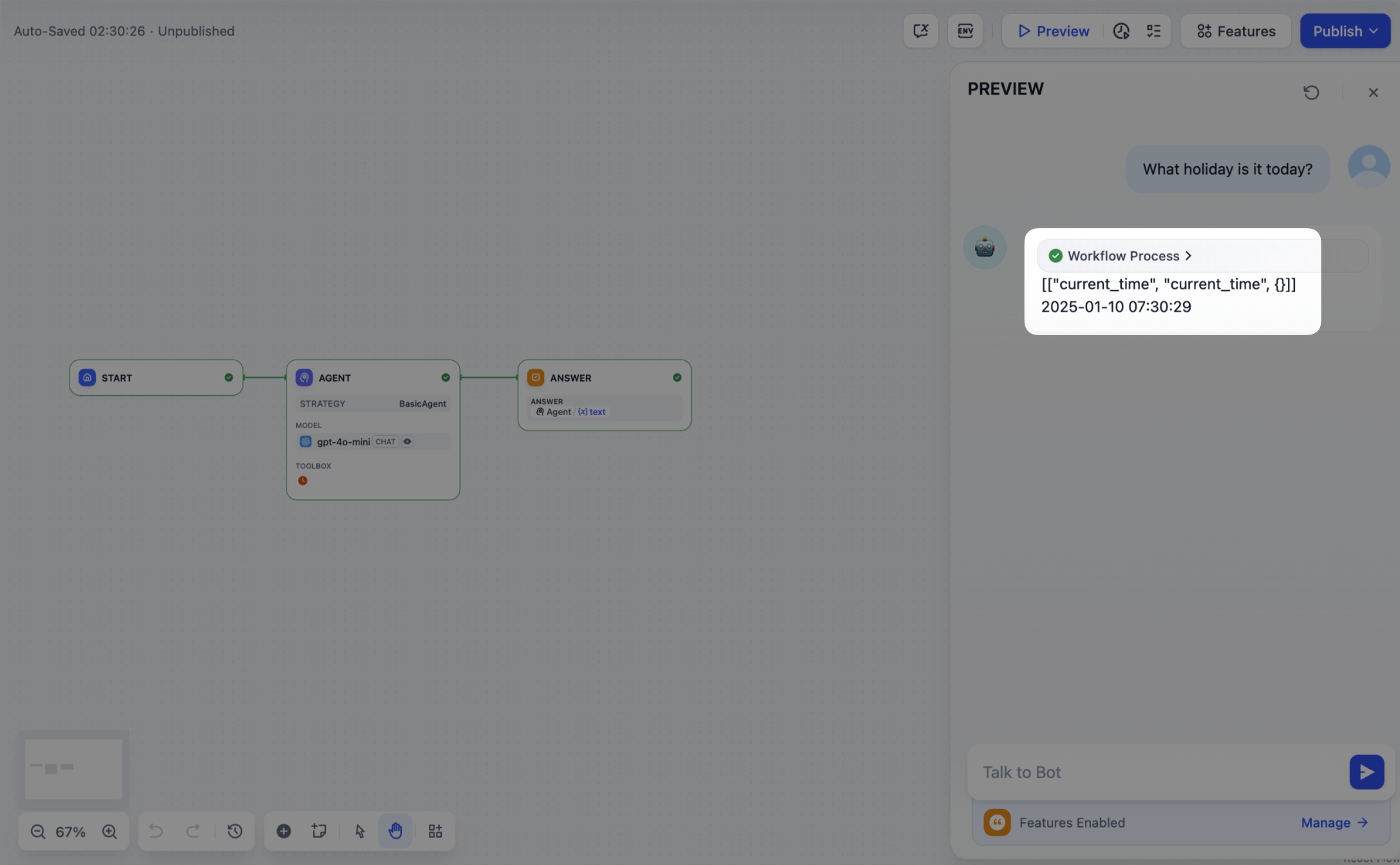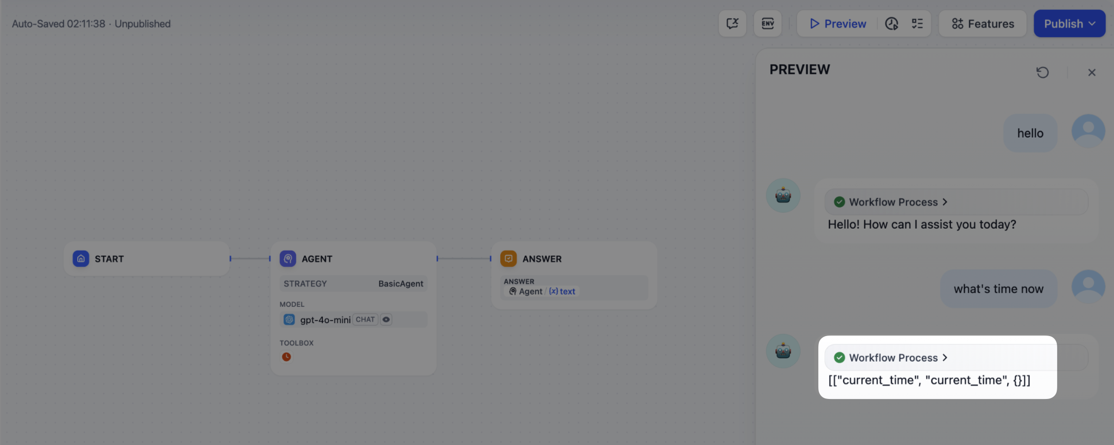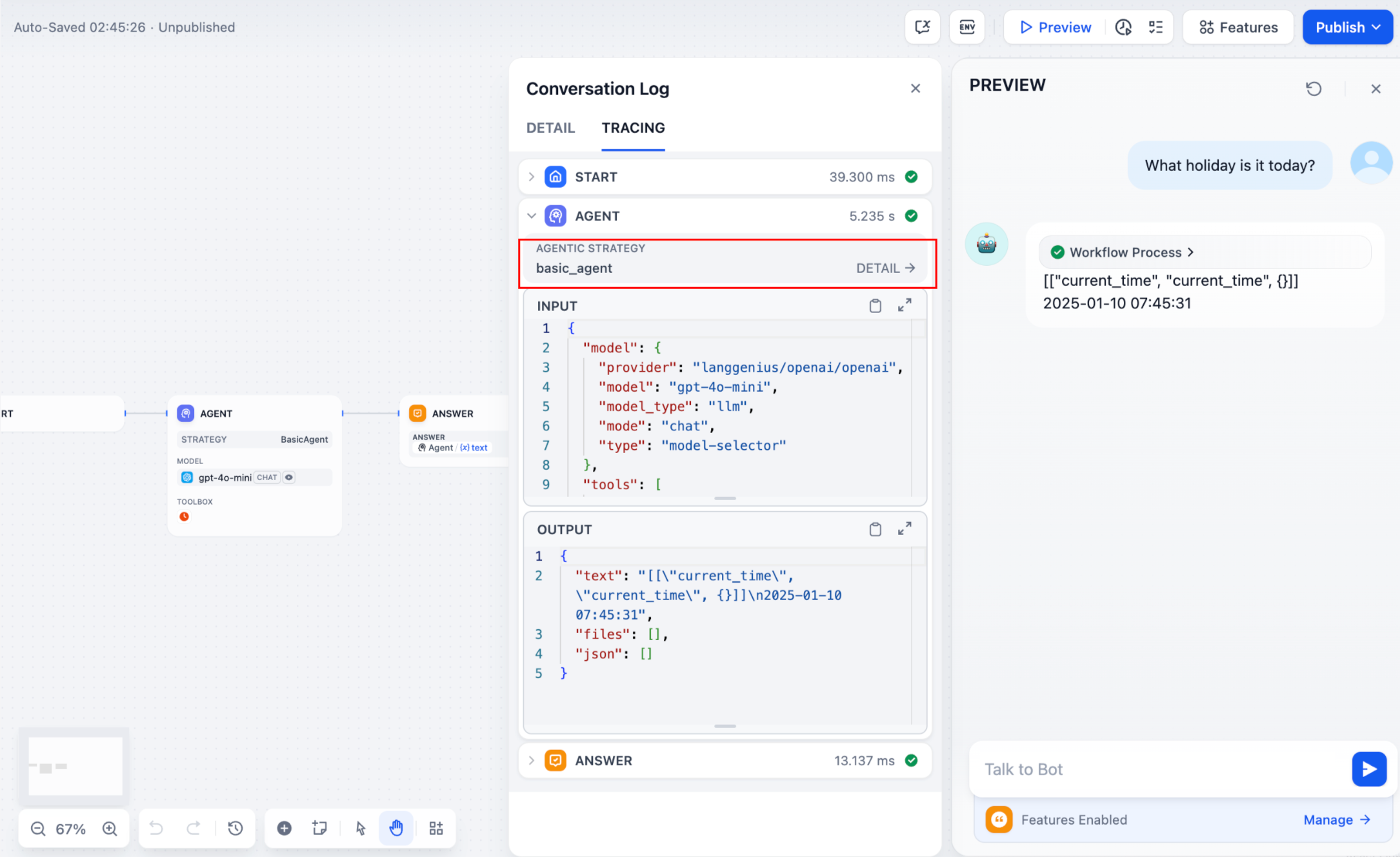 Often, multiple steps are necessary to complete a complex task in an Agent Strategy Plugin. It’s crucial for developers to track each step’s results, analyze the decision process, and optimize strategy. Usingcreate_log_message and finish_log_message from the SDK, you can log real-time states before and after calls, aiding in quick problem diagnosis.