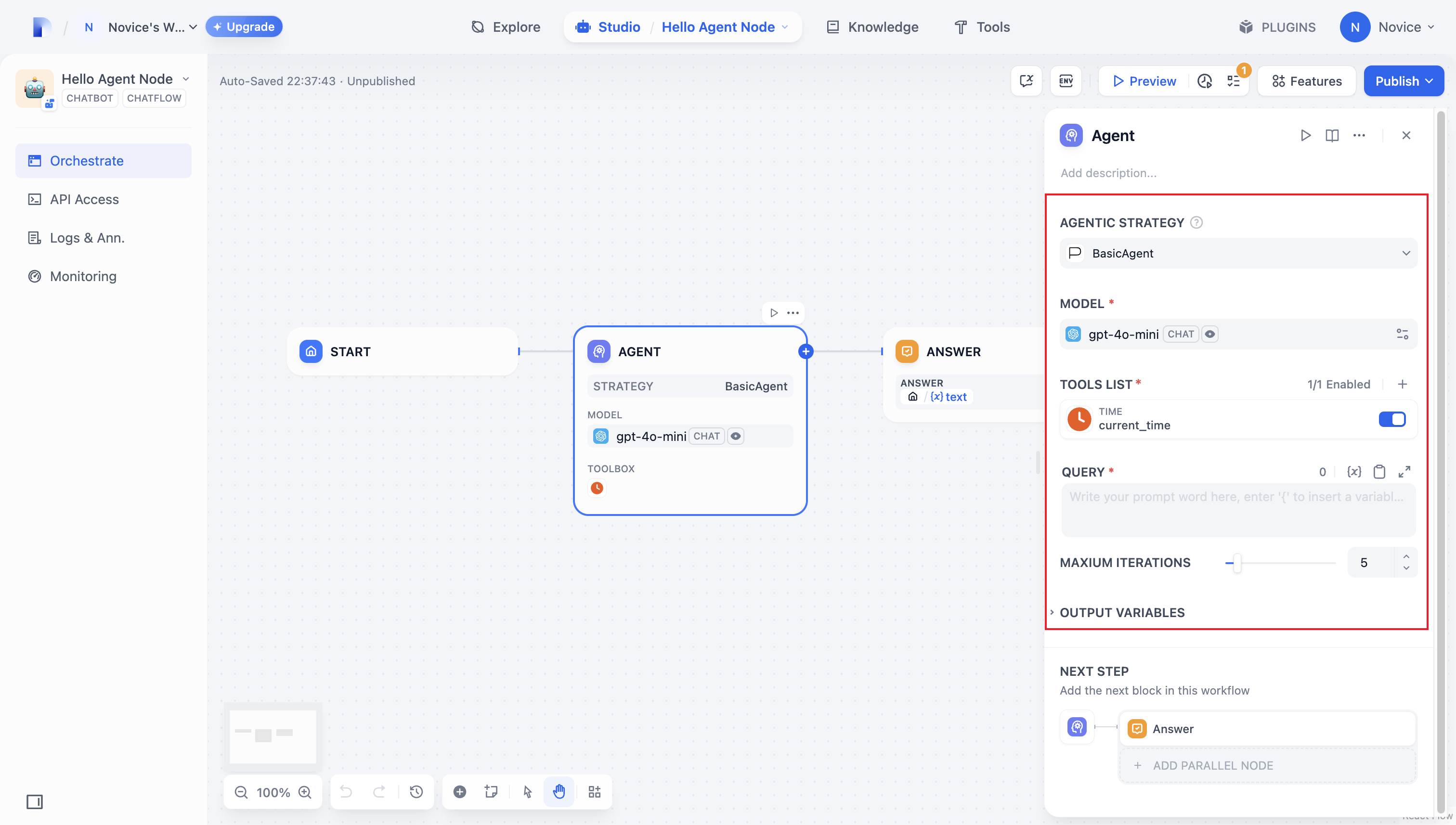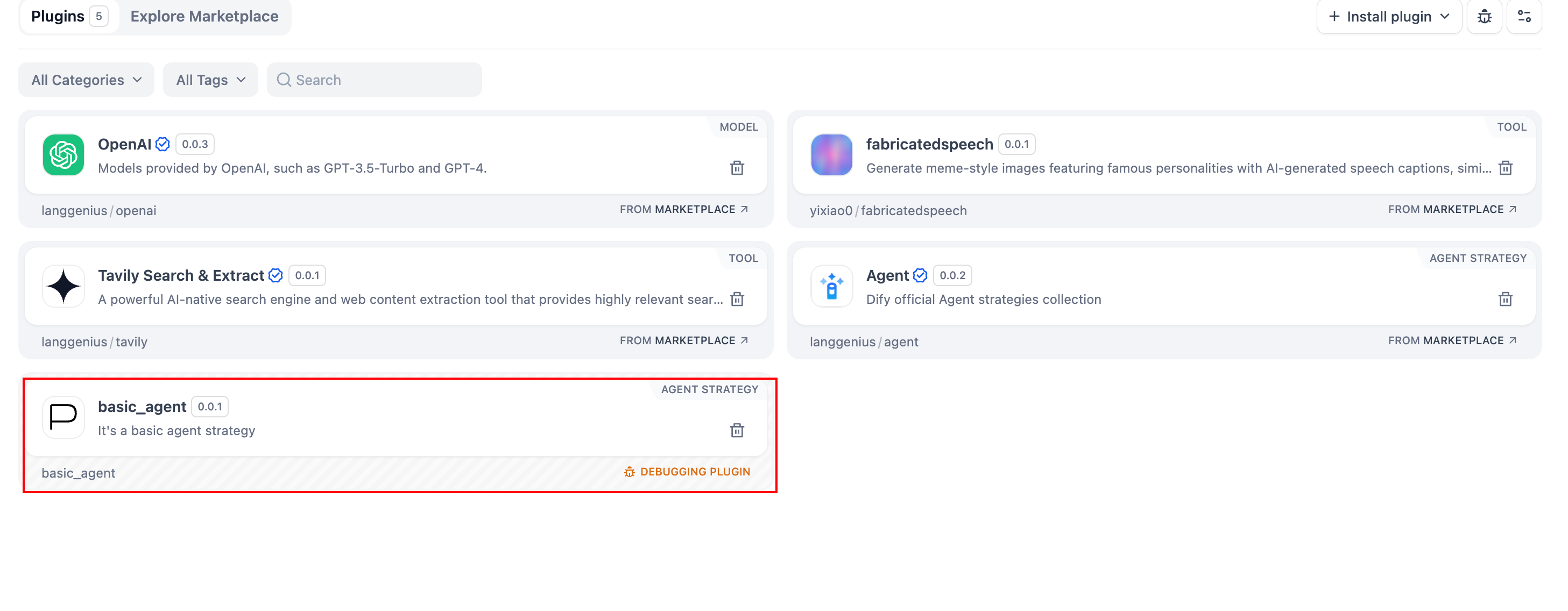 To build an Agent plugin, start by specifying the necessary parameters instrategies/basic_agent.yaml. These parameters define the plugin’s core features, such as calling an LLM or using tools.