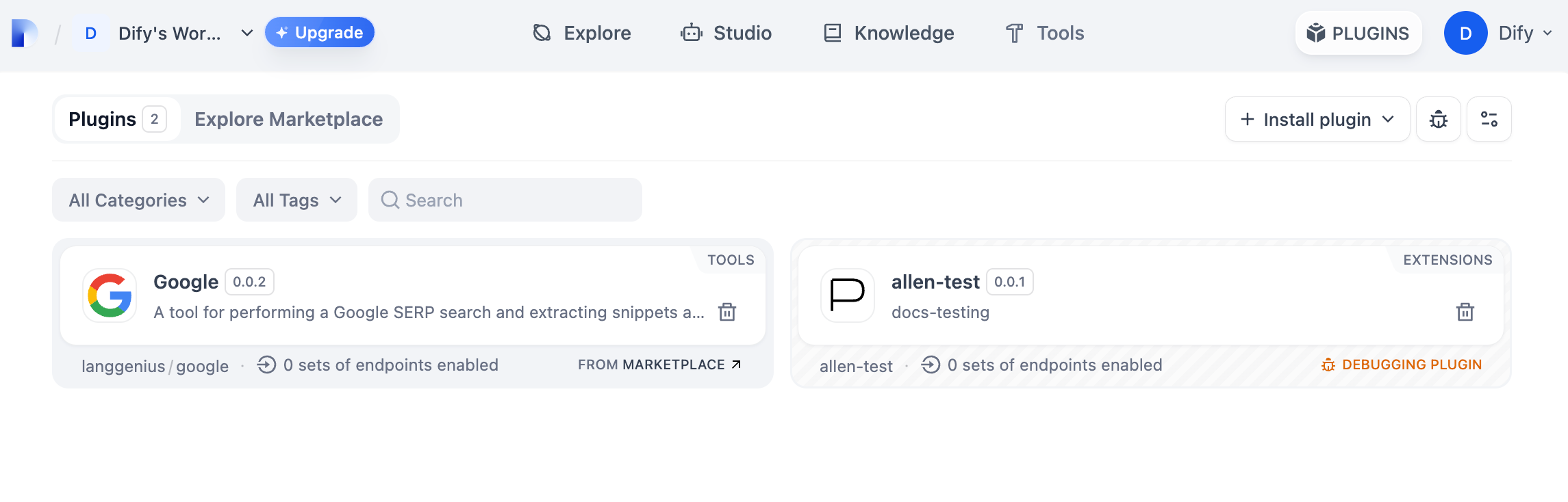 After completing plugin development, you need to test whether the plugin can function properly. Dify provides a convenient remote debugging method to help you quickly verify the plugin’s functionality in a test environment. Go to the “Plugin Management” page to obtain the remote server address and debugging Key.