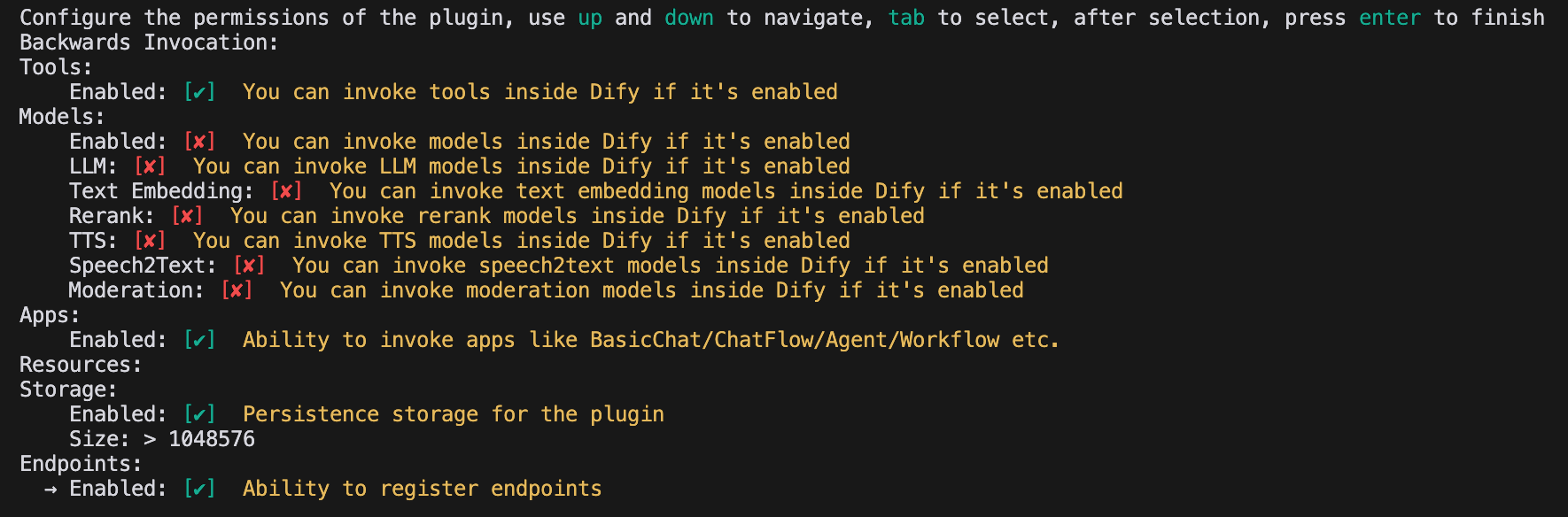 Use the arrow keys in the terminal to select permissions, and use the “Tab” button to grant permissions.After checking all permission items, press Enter to complete the plugin creation. The system will automatically generate the plugin project code.