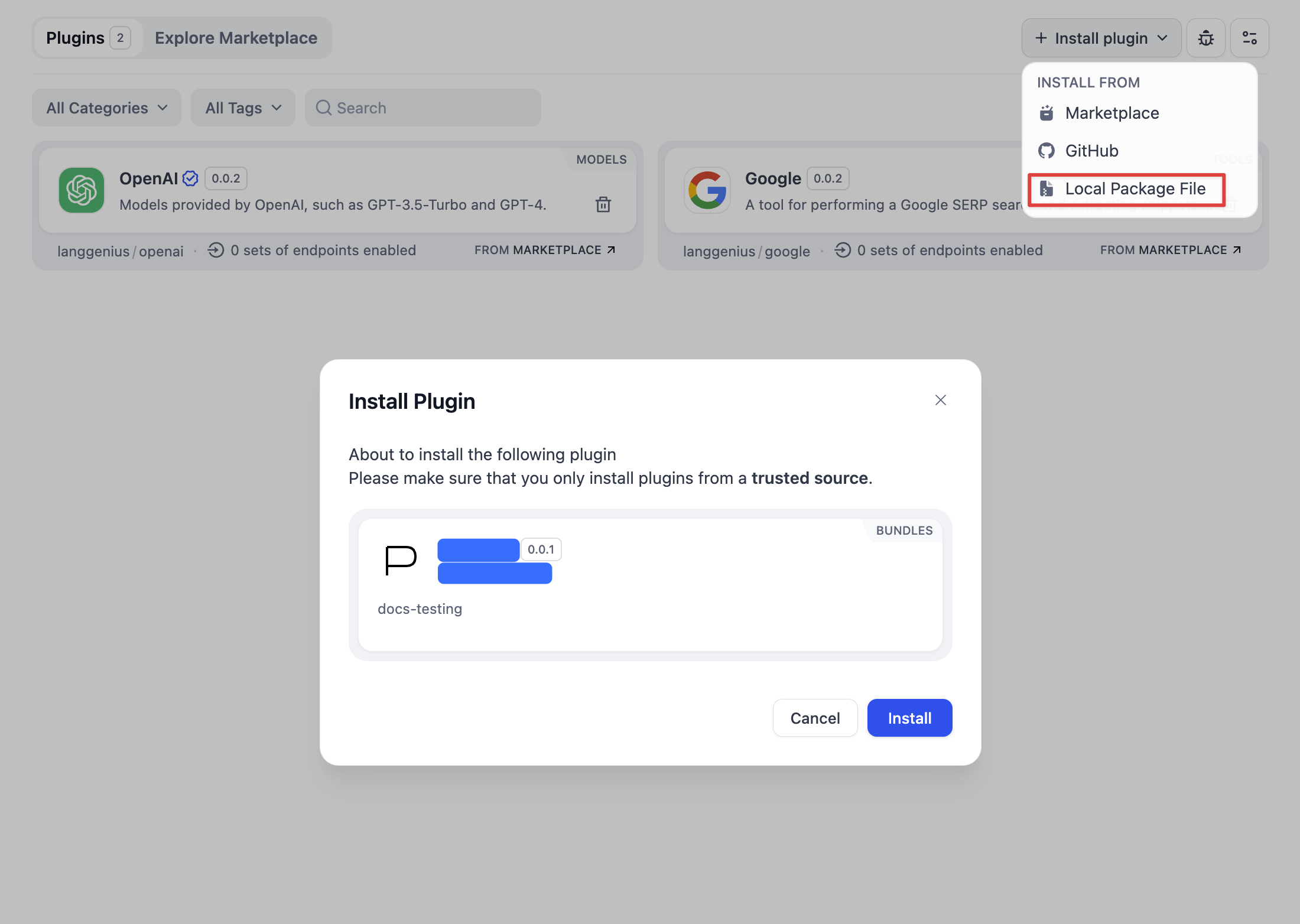Visit the Dify plugin management page, click Install Plugin in the upper right corner → Via Local File to install, or drag and drop the plugin file to a blank area of the page to install the plugin.