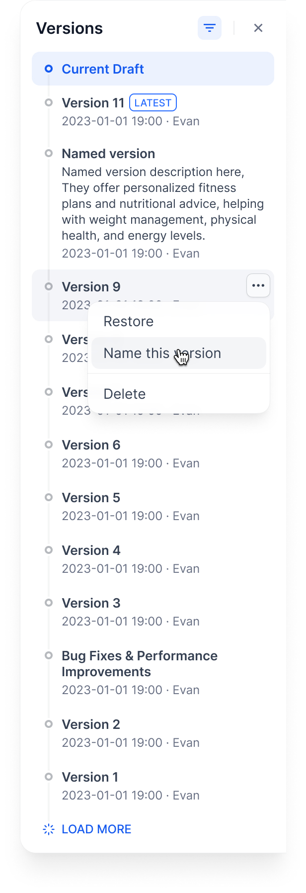Restore a version: Load an old version back into your draft