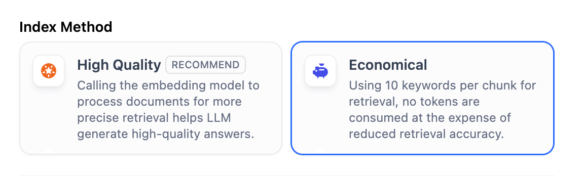 Similar to the search engines use efficient indexing algorithms to match search results most relevant to user queries, the selected index method directly impacts the retrieval efficiency of the LLM and the accuracy of its responses to knowledge base content. The knowledge base offers two index methods: High-Quality and Economical, each with different retrieval setting options.- High Quality
