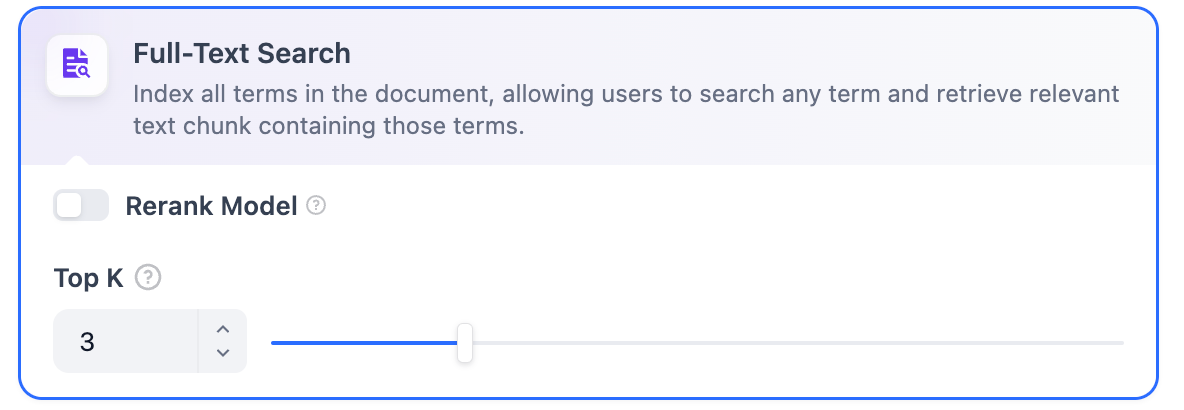 Rerank Model: Disabled by default. When enabled, a third-party Rerank model will sort the text chunks returned by Full-Text Search to optimize results. This helps the LLM access more precise information and improve output quality. Before enabling this option, go to Settings → Model Providers and configure the Rerank model’s API key.