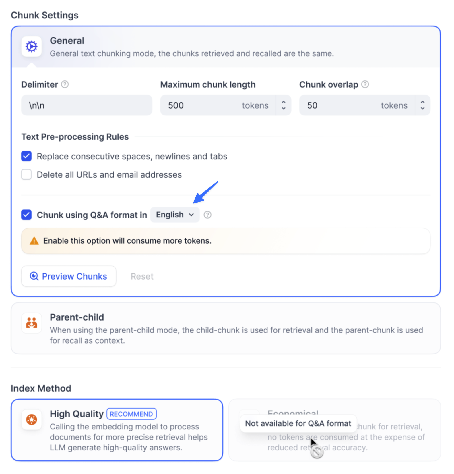 Once a knowledge base is created in the High Quality index method, it cannot switch to Economical later.