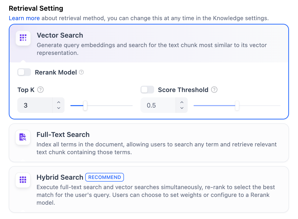 High QualityIn the High-Quality Indexing Method, Dify offers three retrieval settings: Vector Search, Full-Text Search, and Hybrid Search.