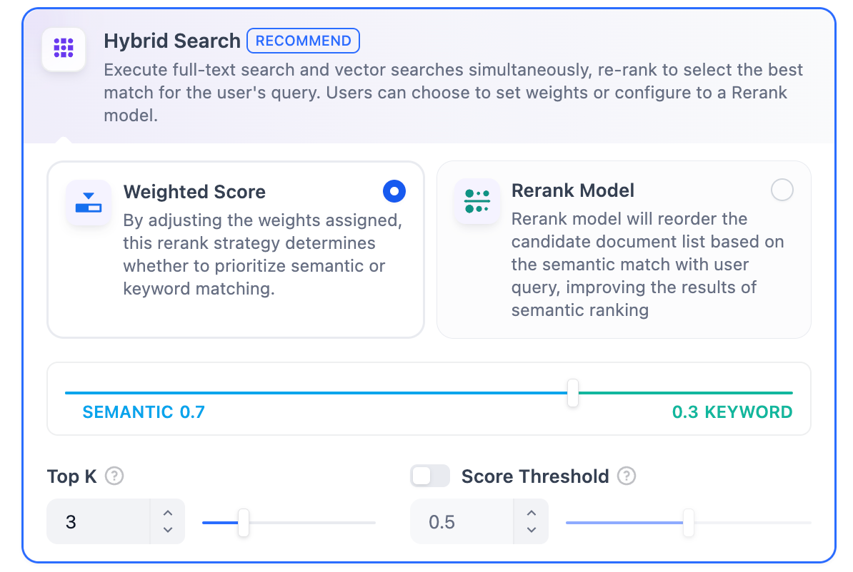 This feature enables users to set custom weights for semantic priority and keyword priority. Keyword search refers to performing a full-text search within the knowledge base, while semantic search involves vector search within the knowledge base.