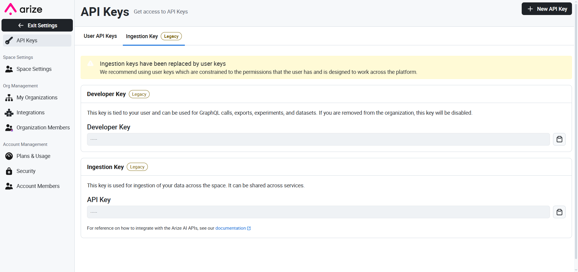 Retrieve your Arize API Key from the user menu at the top-right. Click on API Key, then on the API Key to copy it: