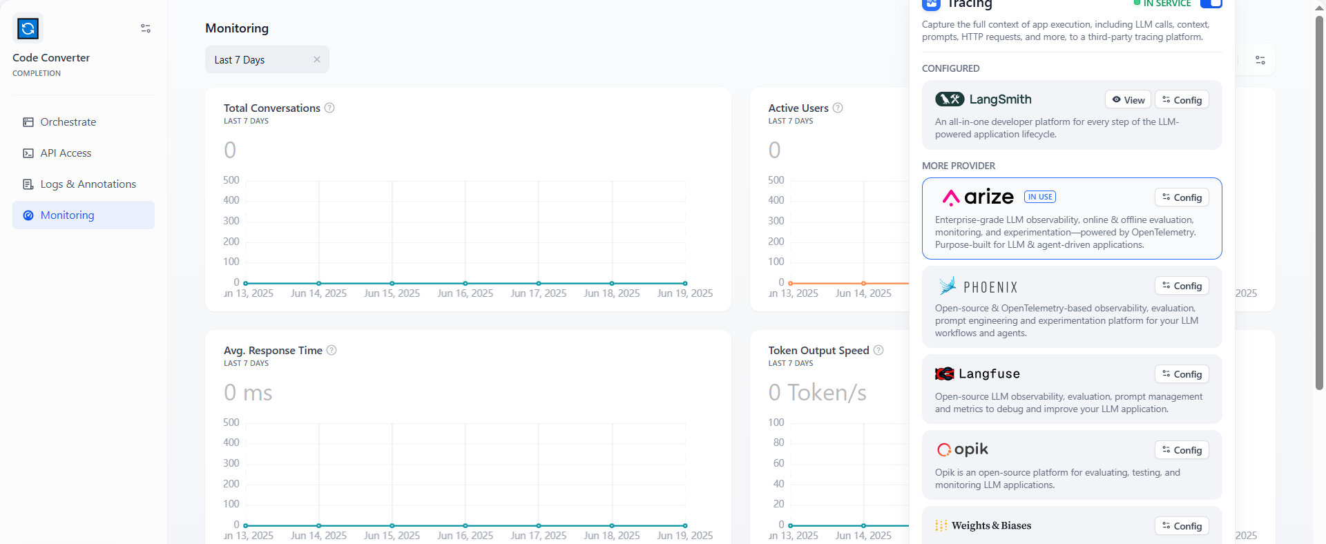 Configure Arize in the Dify application. Open the application you need to monitor, open Monitoring in the side menu, and select Tracing app performance on the page.