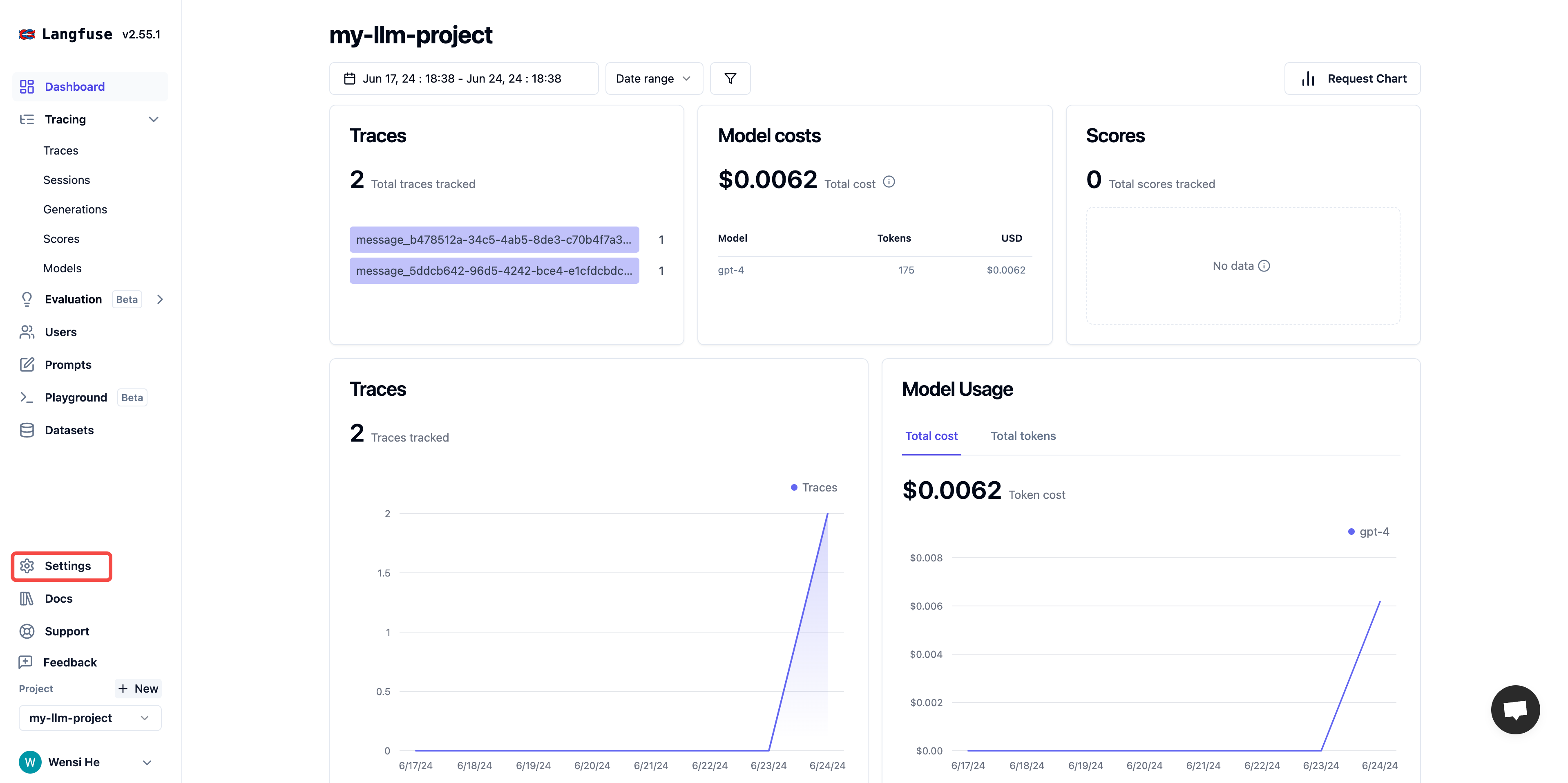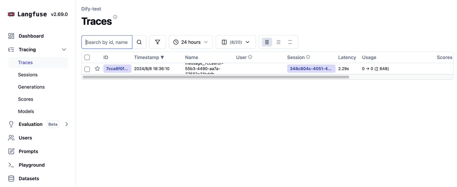 After configuration, debugging or production data of the application in Dify can be viewed in Langfuse.