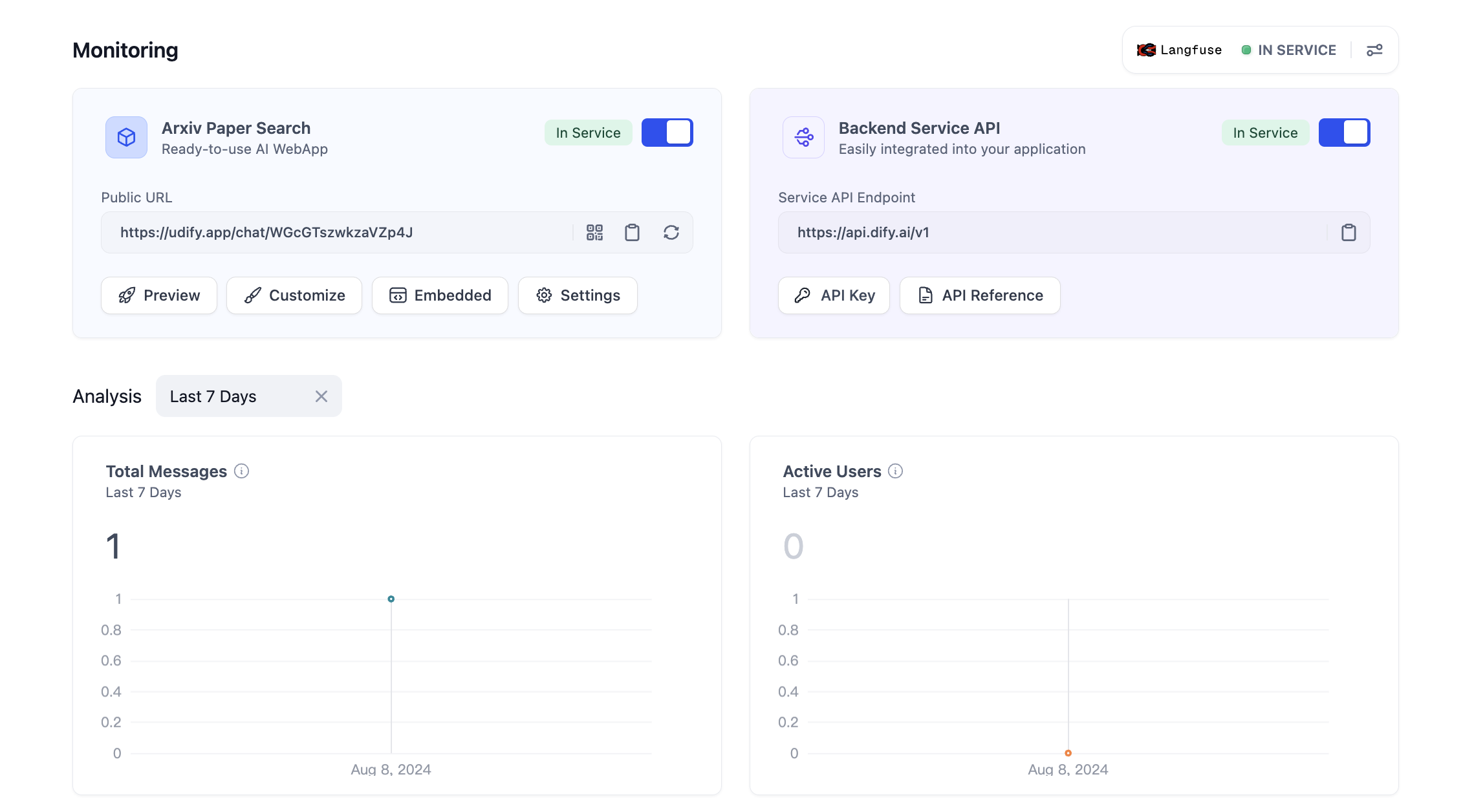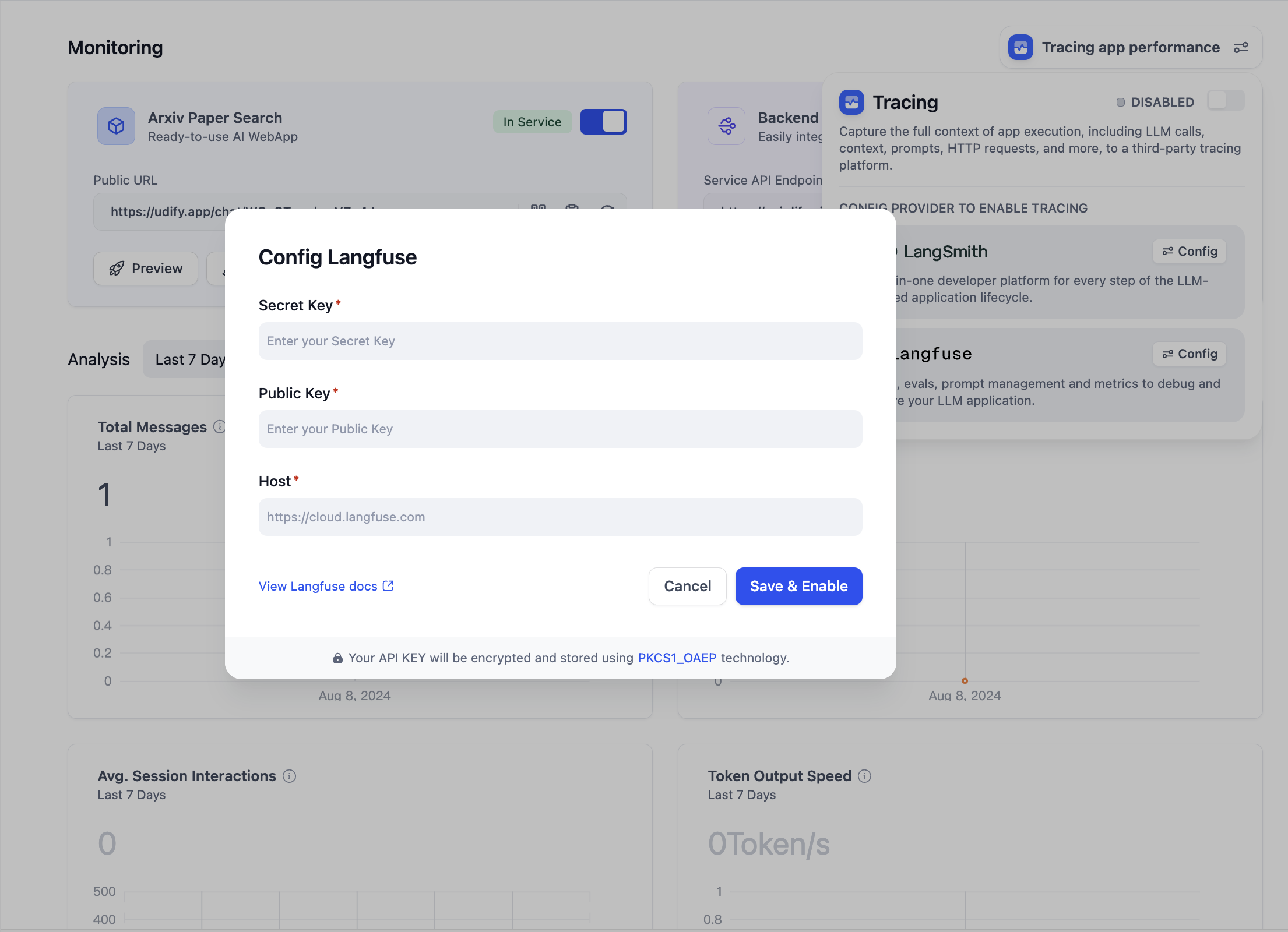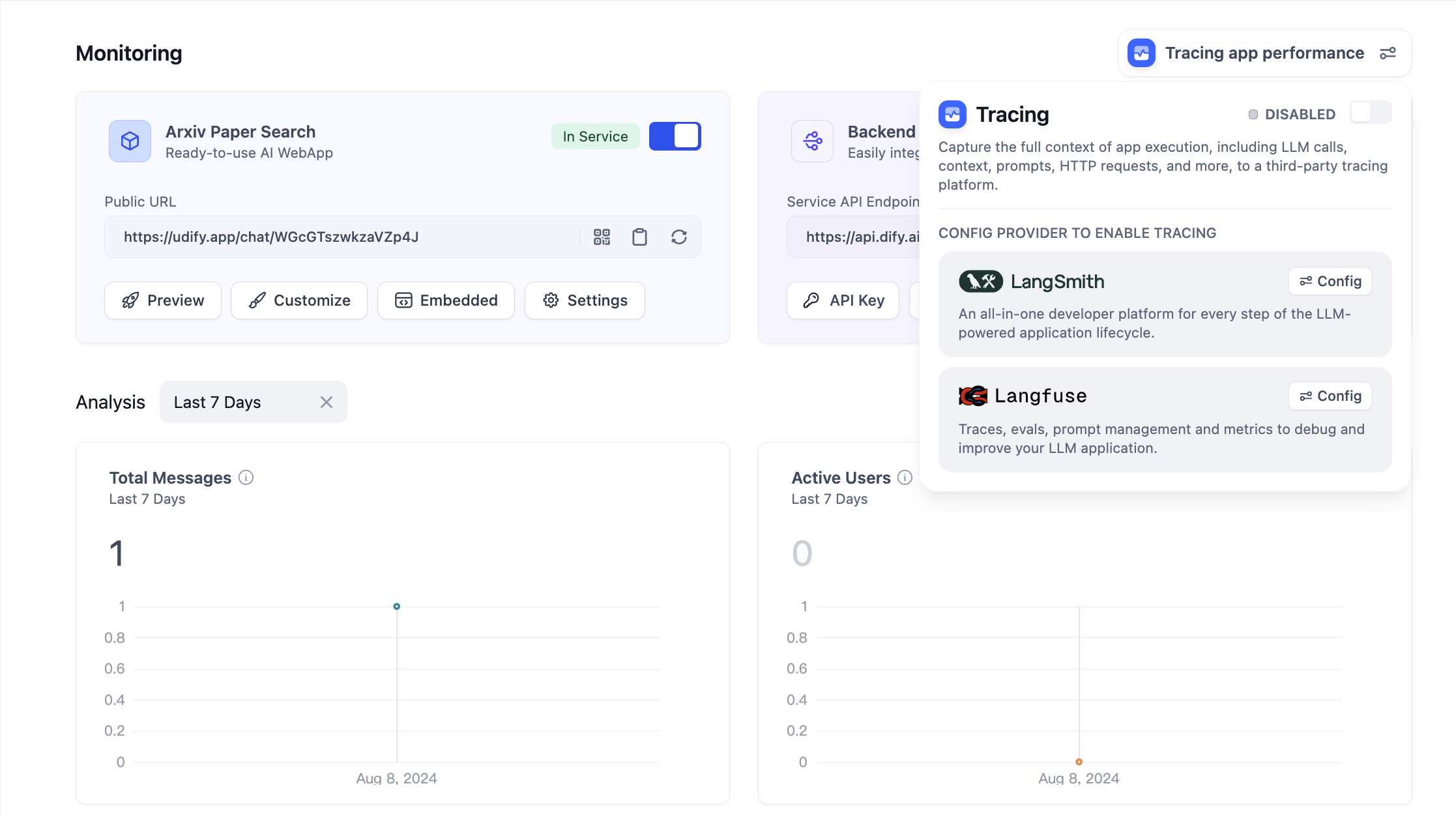 - Configure Langfuse in Dify. Open the application you need to monitor, open Monitoring in the side menu, and select Tracing app performance on the page.