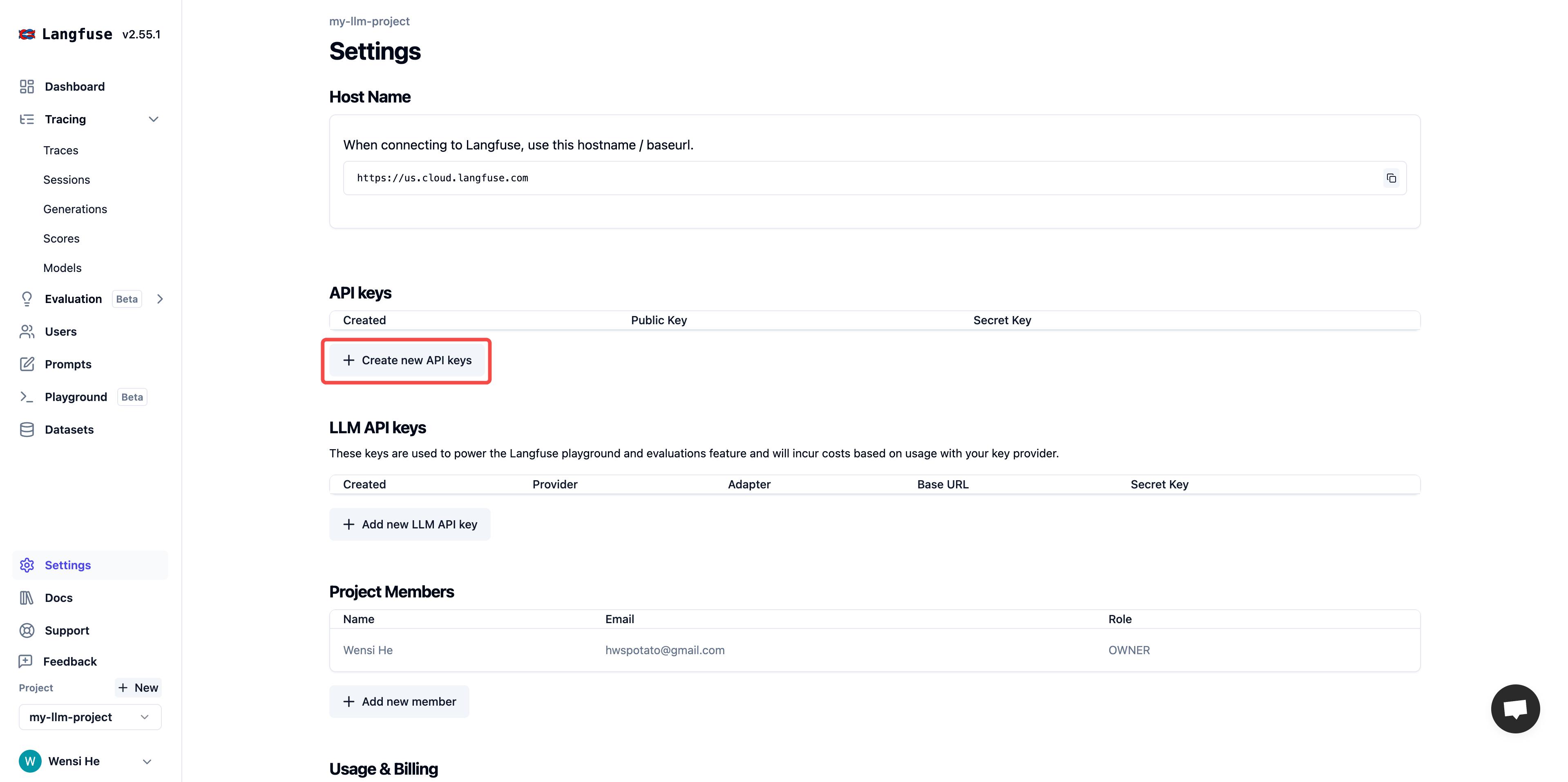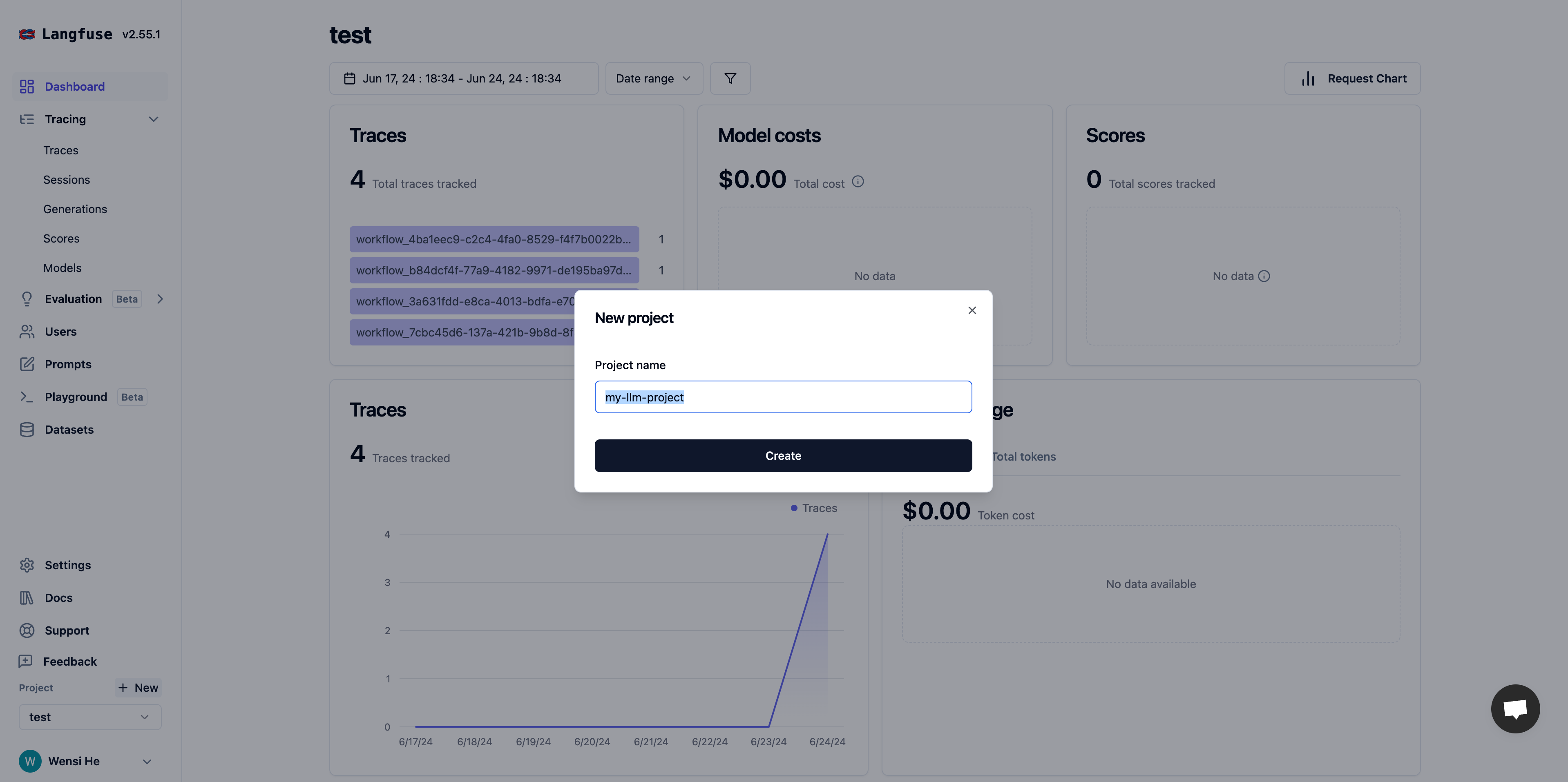 - Create a project in Langfuse. After logging in, click New on the homepage to create your own project. The project will be used to associate with applications in Dify for data monitoring.