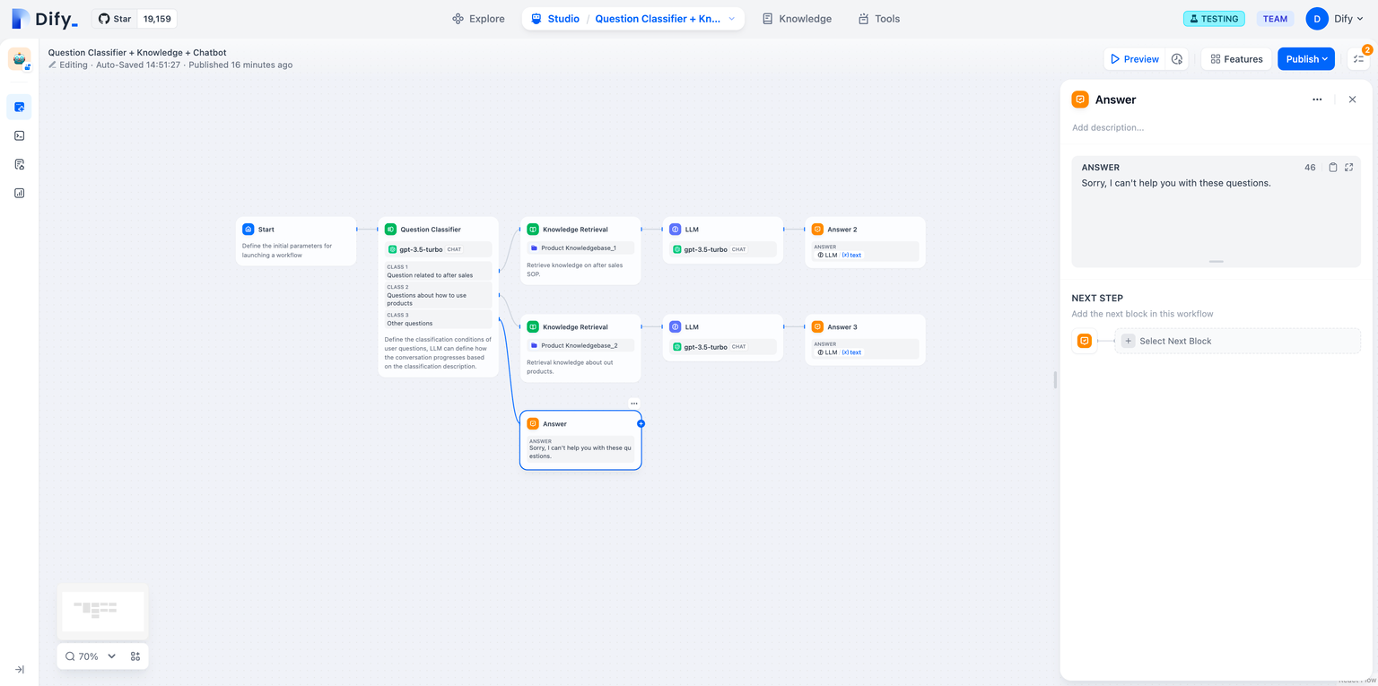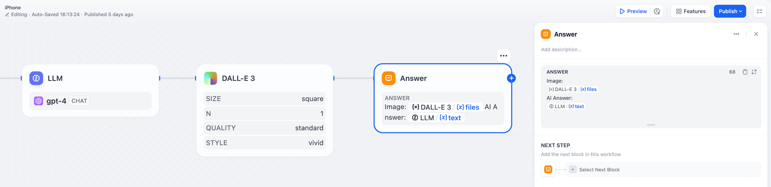 The Answer node provides a flexible text editor where you can craft responses using fixed text, variables from previous nodes, or combinations of both.