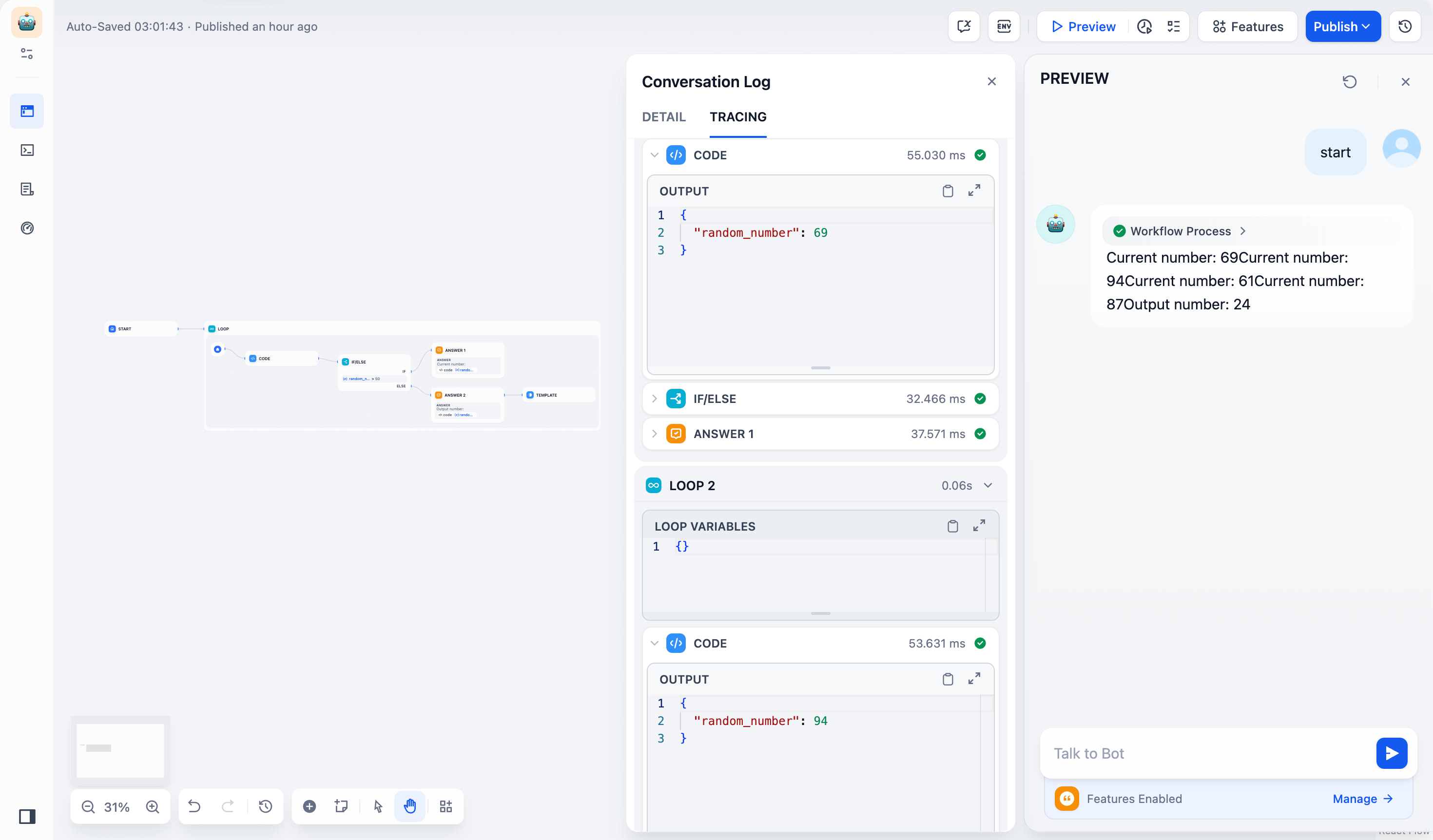 - Code node generates random integers between 1-100