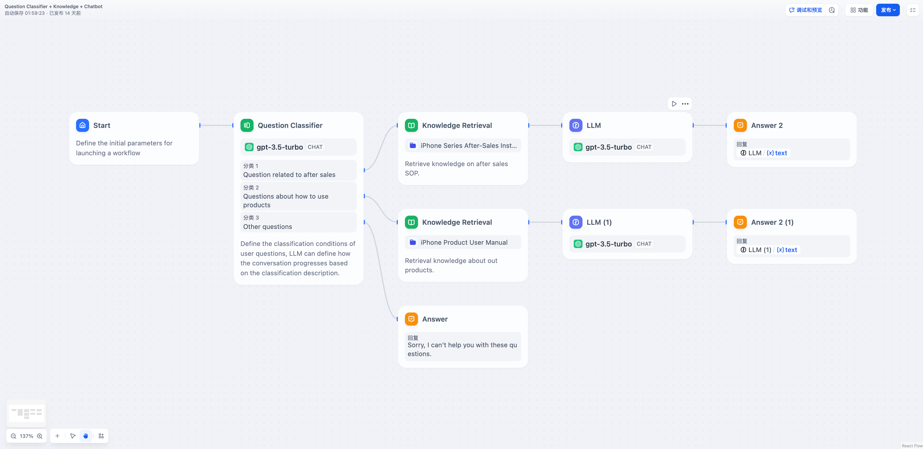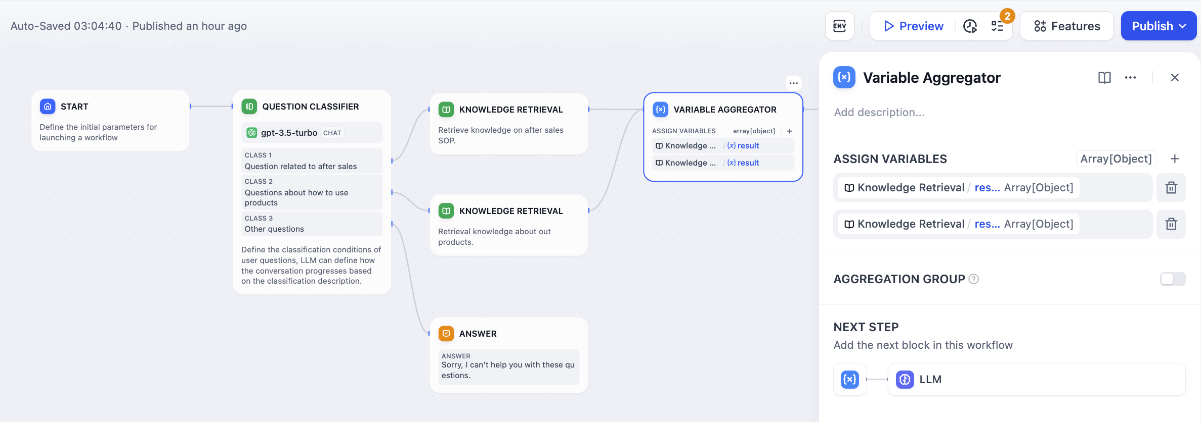 Conditional workflows create parallel execution paths where only one branch runs at a time. Without aggregation, you’d need duplicate downstream nodes for each possible branch outcome, creating complex and maintenance-heavy workflows. The Variable Aggregator acts as a merge point, collecting branch outputs into a single variable that downstream nodes can reference consistently, regardless of which branch actually executed.Classification Workflow Example