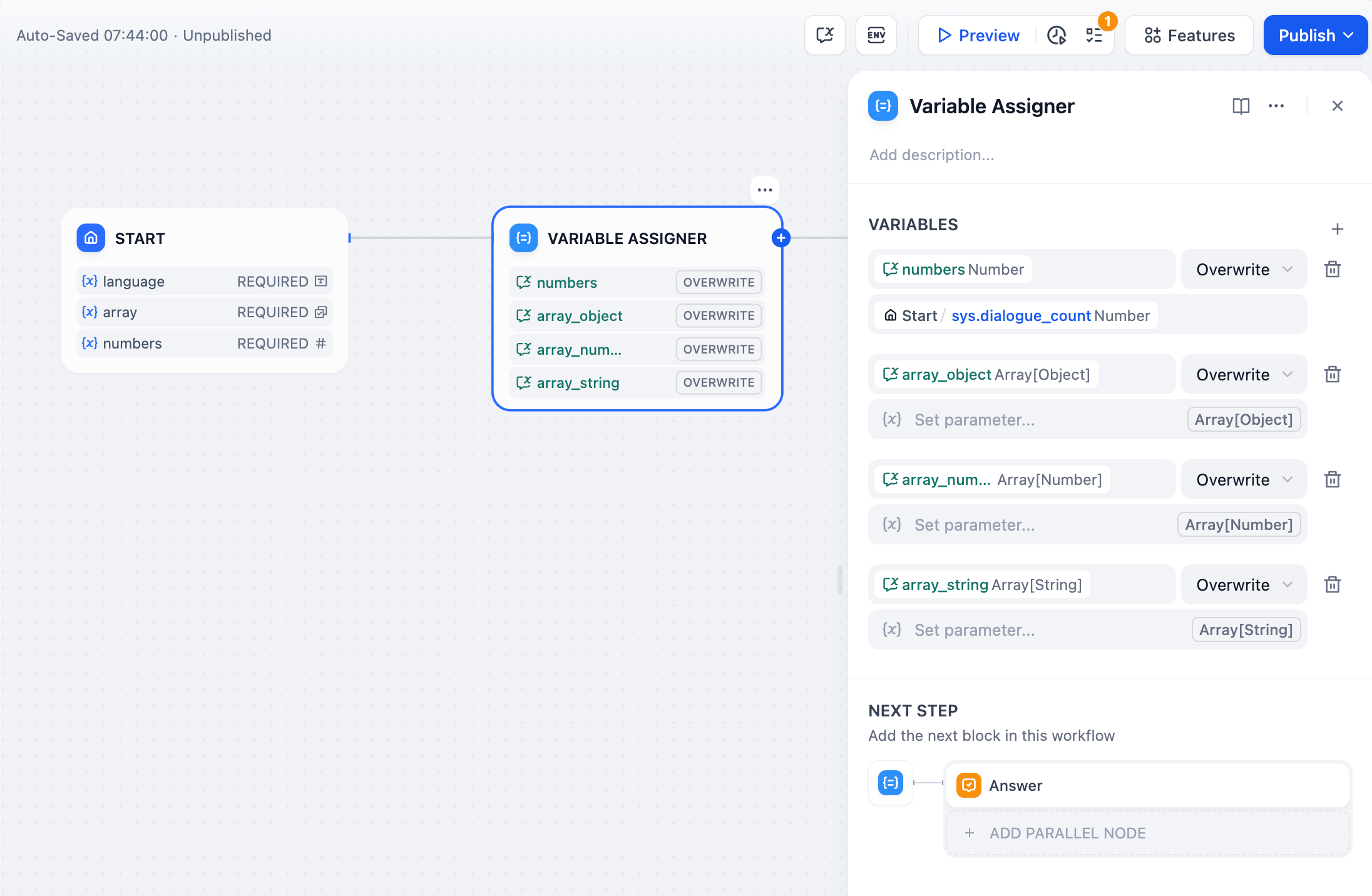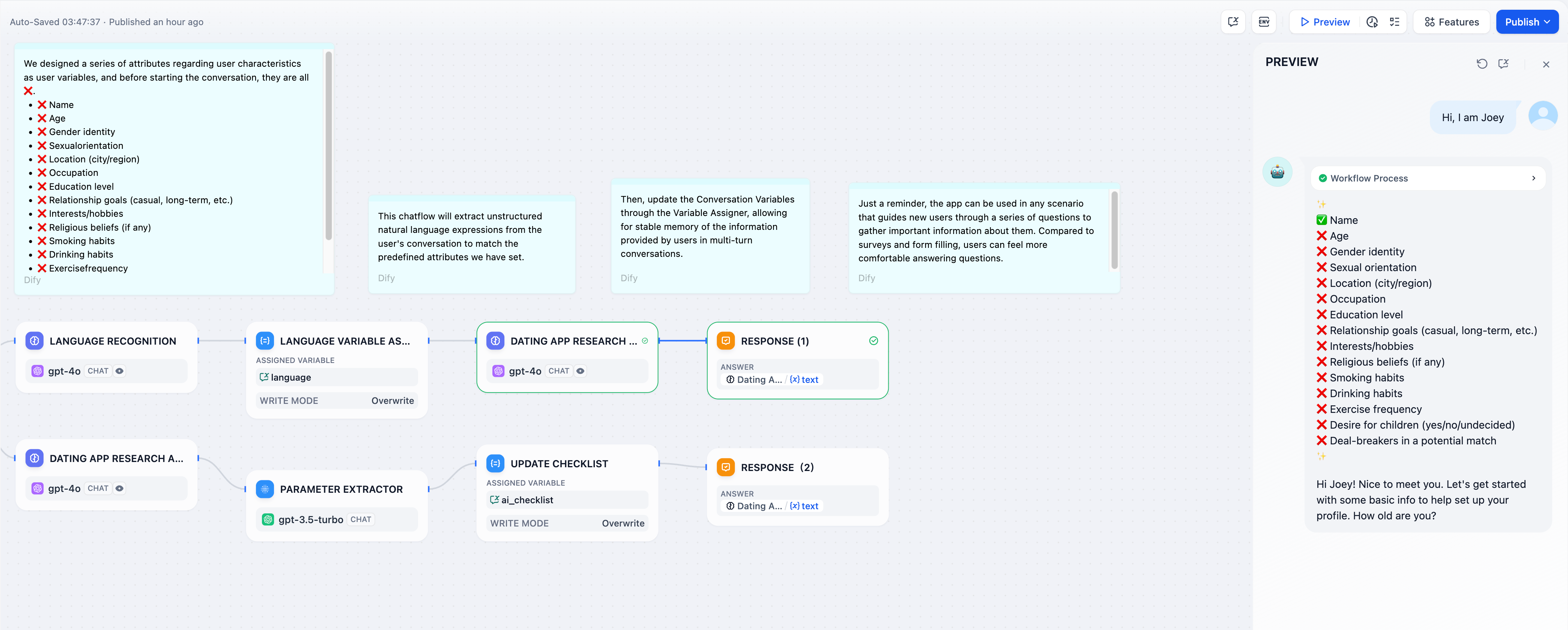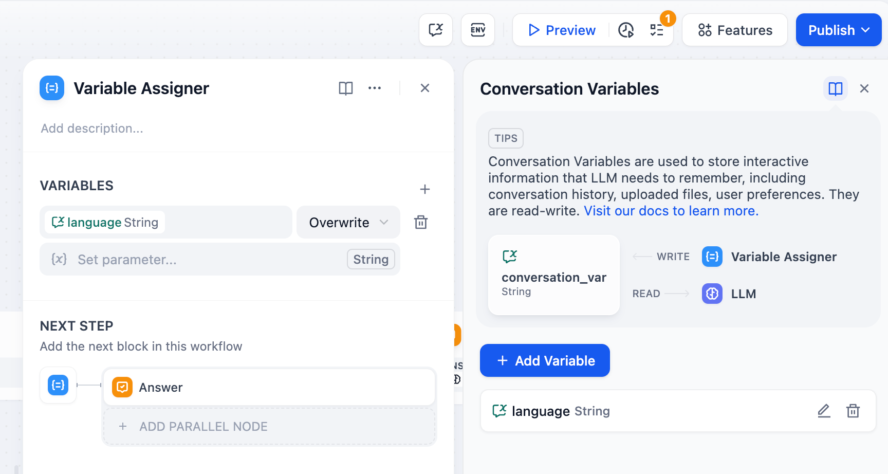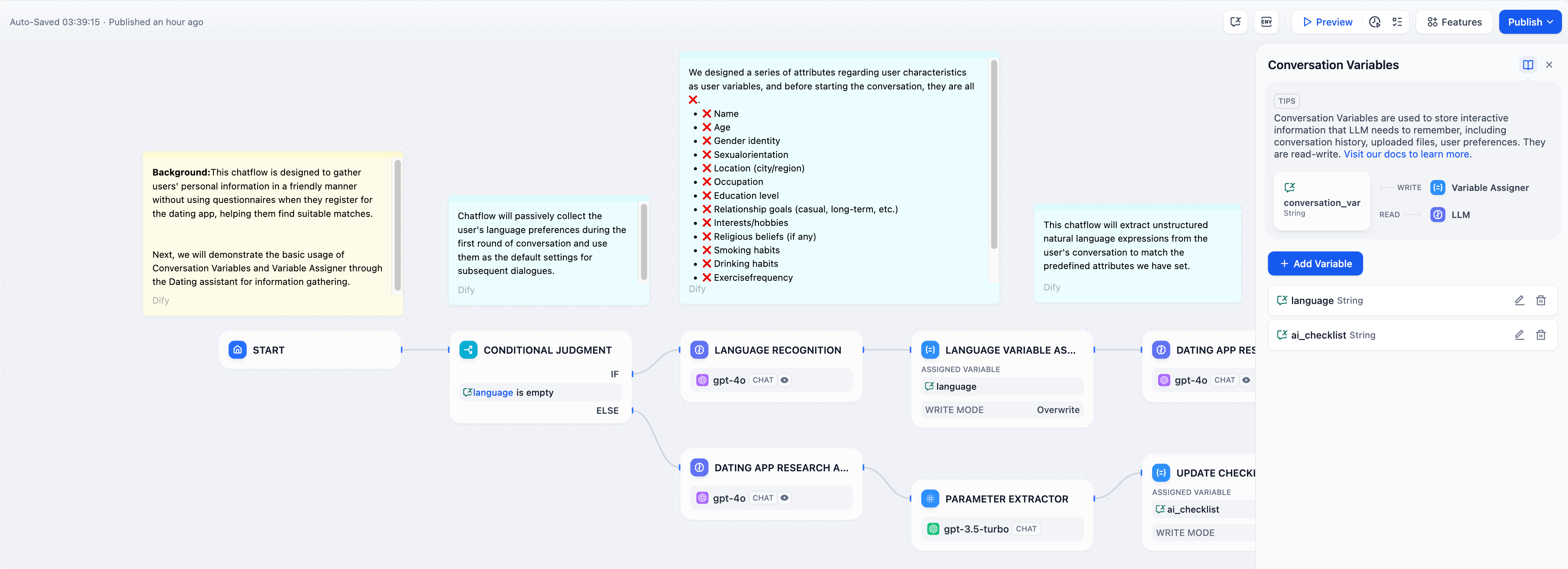 Workflow Variables exist only during a single workflow execution and reset when the workflow completes. Conversation Variables persist across multiple conversation turns within the same chat session, enabling stateful interactions and contextual memory. This persistence enables contextual conversations, user personalization, stateful workflows, and progress tracking across multiple user interactions.Configuration