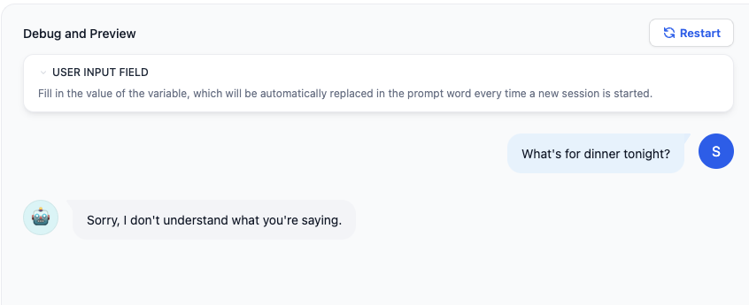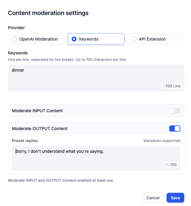 Add the keyword “dinner” in Add Feature - Content Moderation. When the user inputs the keyword, the Agent app outputs “Sorry, I don’t understand what you’re saying.”