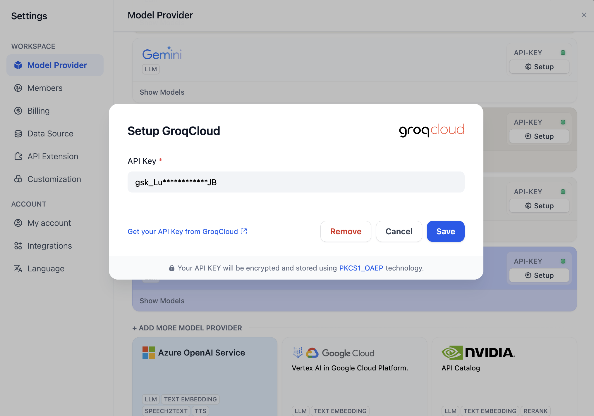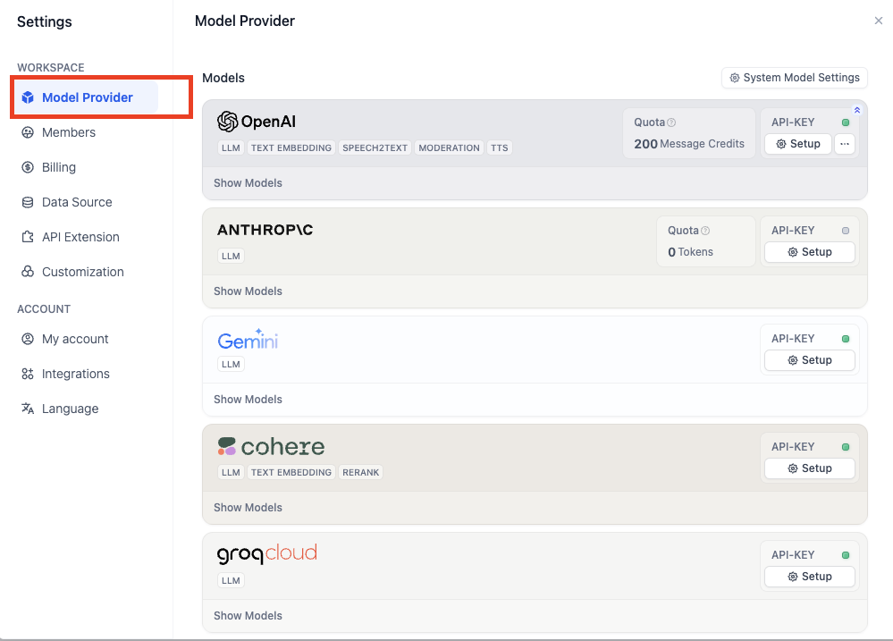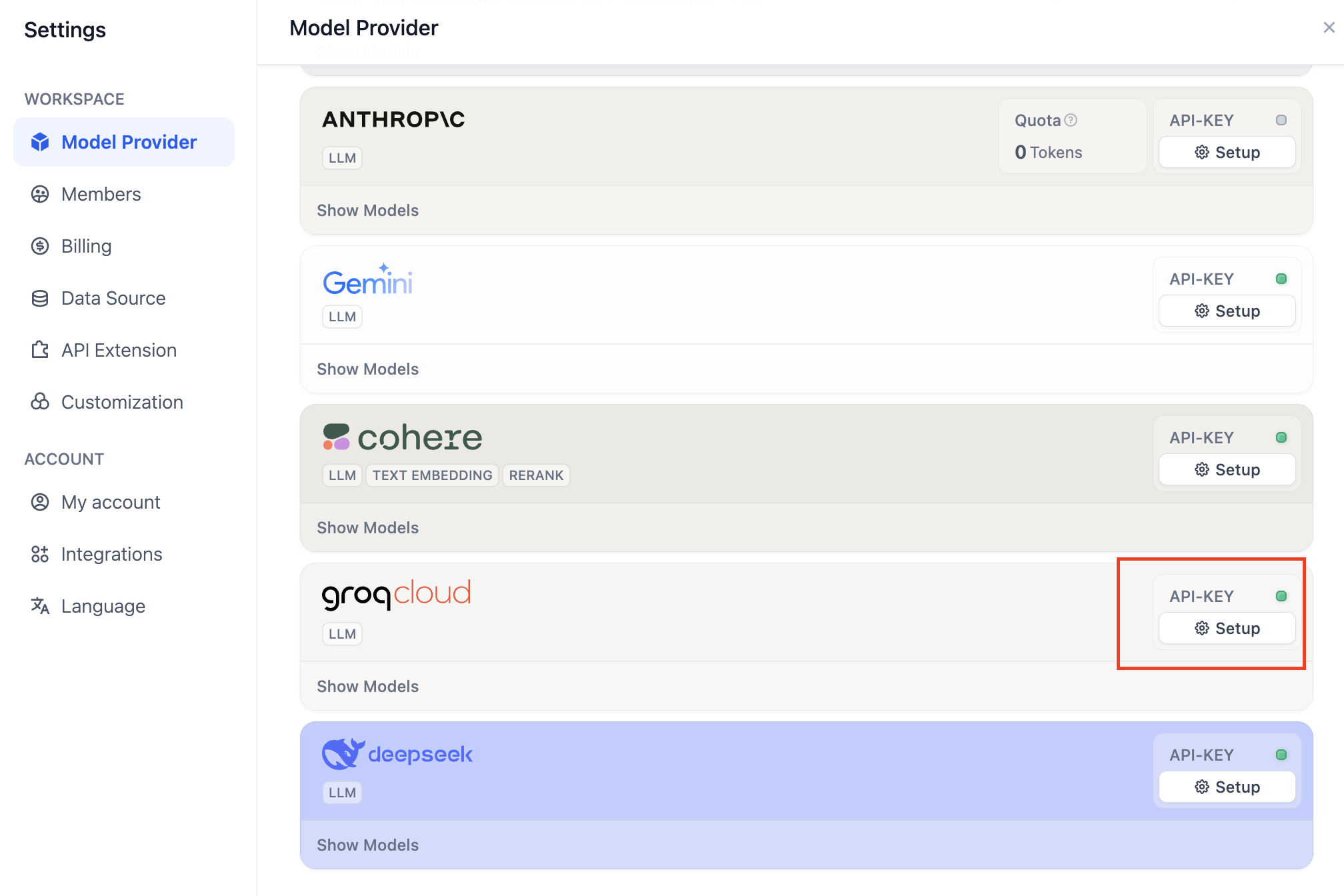 Back to Dify - Model Providers, select groqcloud, and click Setup.
