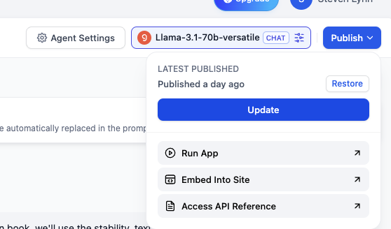 Click the publish button in the upper right corner, and after publishing, select Run App to get a web page for an online running Agent.