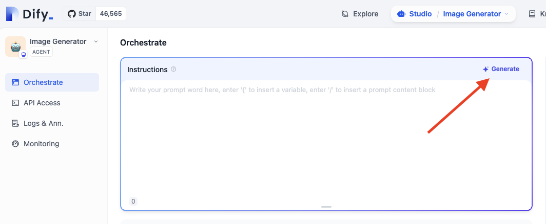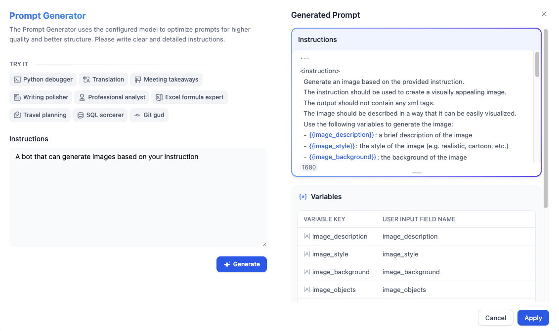 Enter your requirements in the Instructions and click Generate. The generated prompts on the right will show AI-generated prompts.