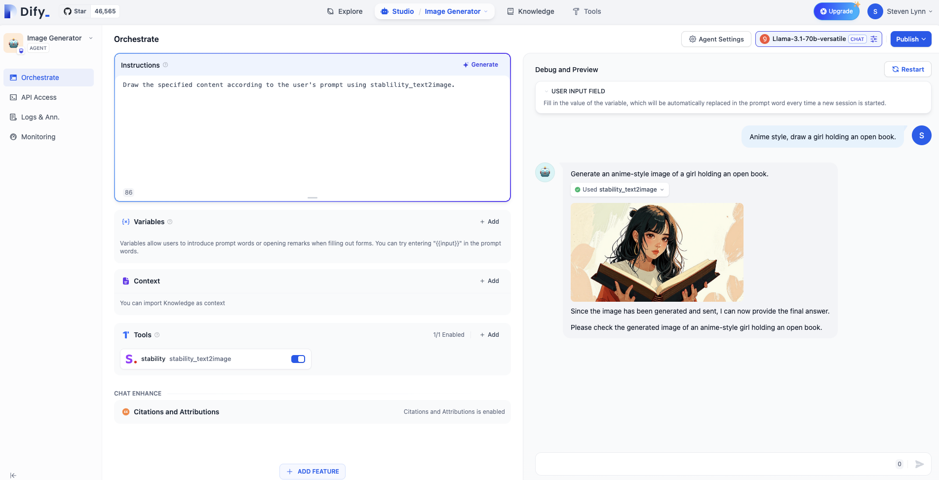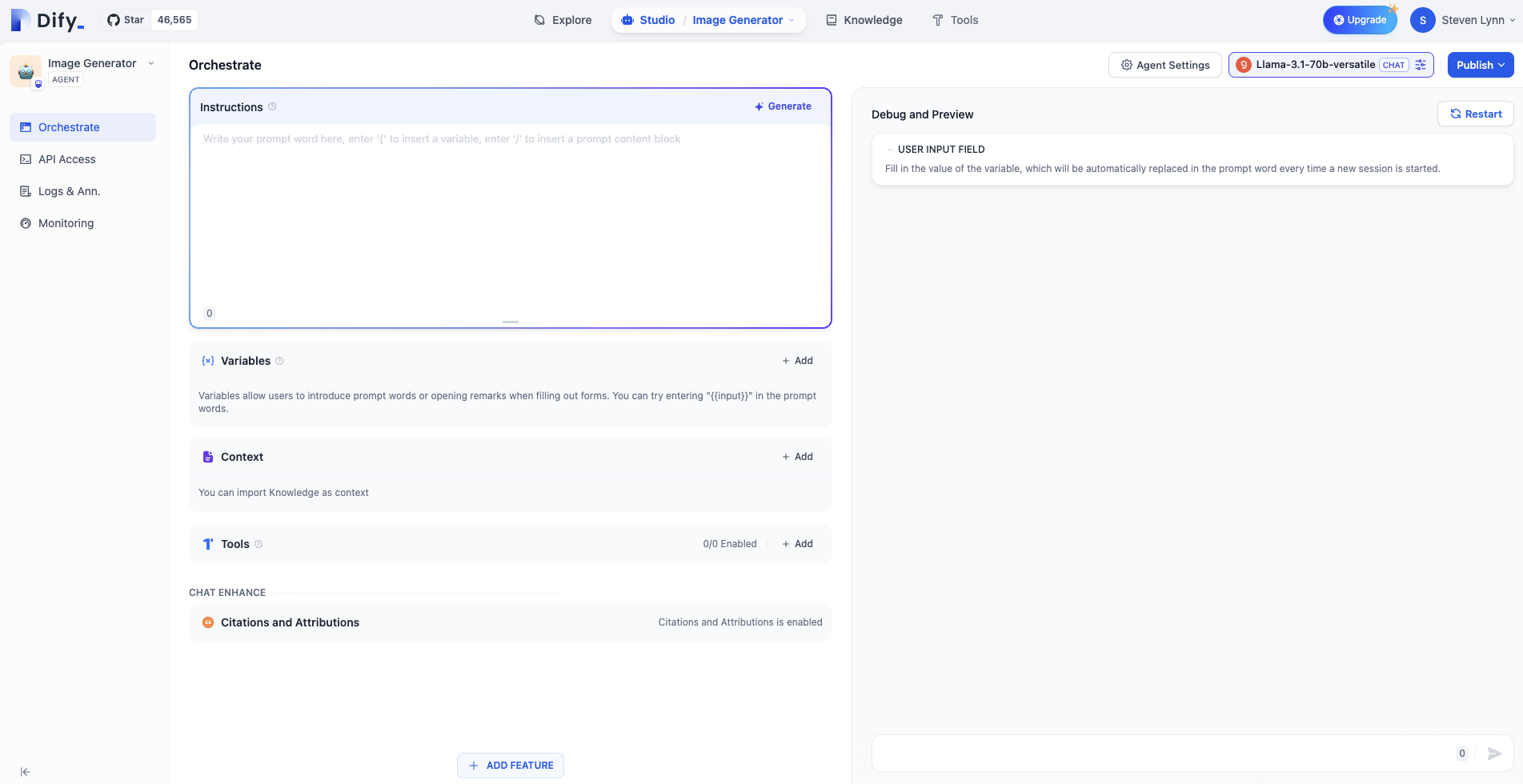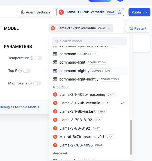 Select the LLM. Here we use Llama-3.1-70B provided by groq as an example: