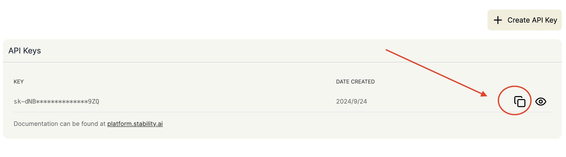 Click here to go to the Stability API key management page. If you haven’t registered yet, you will be asked to register before entering the API management page. After entering the management page, clickcopy to copy the key.