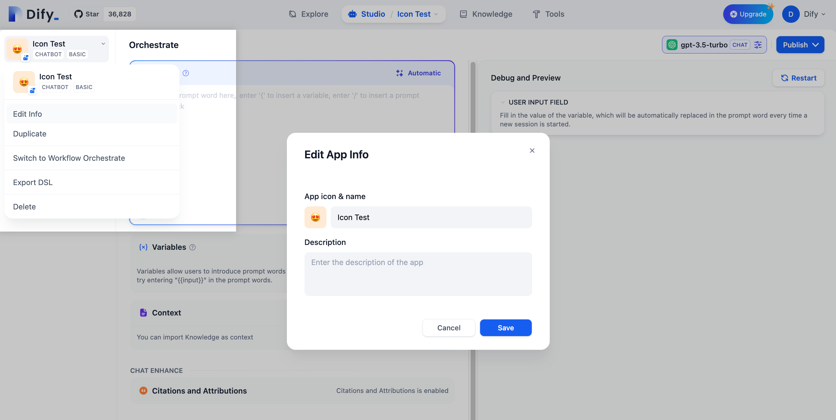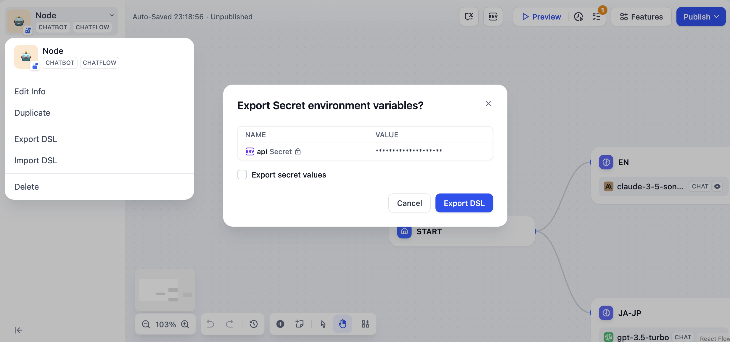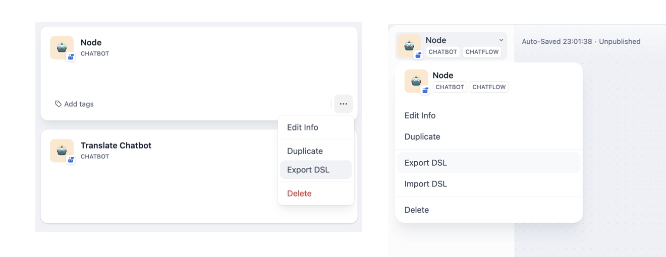 Dify’s DSL (Domain Specific Language) format lets you share apps between workspaces and teams: